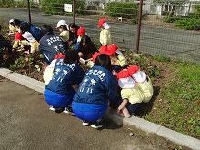 食事の後、園児たちは中庭で折り紙さがしをして楽しんでいました。この折り紙は子どもみらい類型の生徒たちが折ったものを、あらかじめ中庭のあちこちに隠しておきました。閉会式では園児から丁寧なお礼の言葉があり、お土産のサツマイモを持ってバスに乗り込んだ園児たちに手を振ってお別れのあいさつをしました。