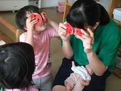 園に到着すると園児たちが寄ってきて、質問をしたり近況報告をしたり、たくさんお話をしてくれました。それぞれのクラスに入り、給食配膳のお手伝いの後おいしく給食をいただきました。片付けを終えると、年少組は園児がそれぞれブロック遊びをし、年中ではピアニカの練習をする園児のそばで、いくつかのグループが歯医者さんごっこする様子がみられました。生徒たちはブロック遊びをいっしょにし、ピアニカを聴いていました。年長になると、話しかけてくる園児、体当たりで背中に乗ってくる園児、方法はさまざまですが、園児たちはみな「お姉ちゃん先生」とお話をしたくてしかたがないという風で、一生懸命コミュニケーションをとりに来てくれました。生徒たちも、園児たちとのコミュニケーションを存分に楽しみました。
