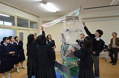 最初は雰囲気が硬かった生徒達も、①~③とワークが進むにつれてだんだん会場が盛り上がっていきました。生徒達はこのような「講座」に参加しない限り、協力して巨大オブジェをつくる体験はまずないことでしょう。参加者にとって印象深いひとときになったと思います。