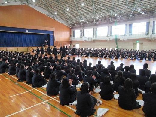 生徒会長あいさつの後、1年生各クラスに記念品の贈呈