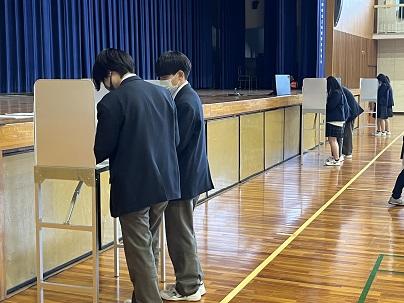 実際に選挙で使う記載台と投票箱をお借りした本格的な内容で、数名は本当に自分たちが学年主任を選ぶんだと勘違いした人も。