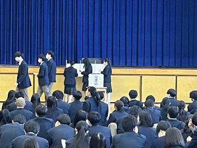 まず、西陵生のみなさんがより自分事としてリアルに選挙を感じられるよう、1時間目は『第1回 29回生主任選挙 選挙公報』として、担任の先生方が次期学年主任の候補者になり、もし自分が学年主任になったら?という公約をマニュフェストとして示し、それをもとに29回生のみなさんが候補者を選び、実際の投票と同じ手順で投票用紙に選んだ候補者の名前を記入し、投票箱に入れて投票するというものです。