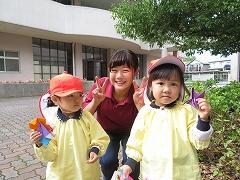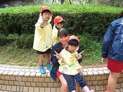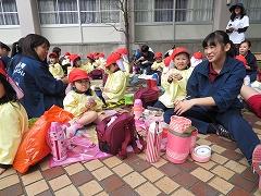 中庭で昼食をとった後、生徒たちがつくって隠しておいた宝物を探す探検をしました。園児たちは両手いっぱいに宝物を持って嬉しそうでした。