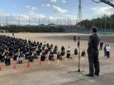 授業開始の合図の後に非常ベルが鳴り、その後の放送により確認した火元を避ける避難経路にて速やかにグラウンドへの避難を行いました。