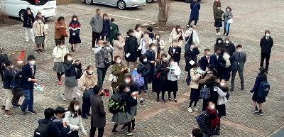 2階ベランダから吊り下げられた合格者の受検番号一覧を見上げて、喜びの声が上がりました。