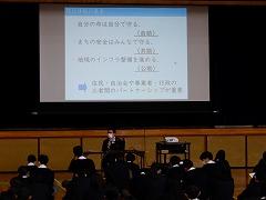 10月28日(木)7限、防災学習会を行いました。講師は 人と防災未来センター主任研究員の 河田慈人 先生で演題は『みんなで考えるこれからの防災・減災』でした。1995年1月17日の阪神淡路大震災の教訓から始まり、50枚に及ぶスライドを用いてコロナ禍での避難行動の注意点や、災害時の気象庁のホームページからの情報などについて、これまでのご自分の災害派遣の経験を生かしたご説明をいただきました。最後に生徒代表のあいさつがあり、今後の生活で防災に気をつけていきたいと述べました。また、PTA役員の方にも学習会に参加していただきました。河田先生、本日は大変ありがとうございました。