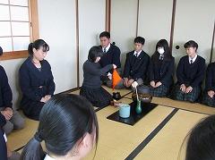 10月23日(月)、家庭基礎の授業において、茶道体験が行われました。講師は本校茶道部講師である表千家教授 矢野 冨美子先生です。今日は矢野 晶子先生が亭主となり、お点前を披露してくださり、主客として、類家 稚香子先生がお席に入られました。1年6組の生徒全員がお席に入らせていただき、まず、お点前を拝見させていただきました。洗練されたお点前に皆、見入っており、しんと静まったお茶席では茶釜の湯の沸く音、柄杓から落ちる湯の音、茶筅が振られる音が耳に響き、「和敬清寂」の「寂」を感じることができました。