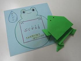 そして、本校では1年科目「家庭基礎」において2学期に保育分野を学習したことを生かして1年生各クラスで「かえる」の折り紙を作成しました。