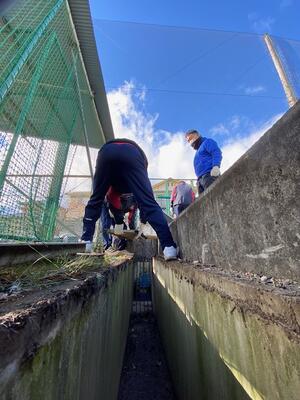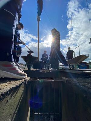 始業式を終えたあと、自分たちの時間を使って集まり、側溝にたまった土を黙々と上げ続ける姿がありました。