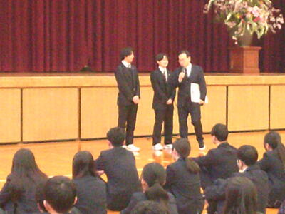 生徒を代表して、生徒会長の藤田耀太さんが離任される先生方、1人1人にメッセージを伝え、お別れの挨拶としました。