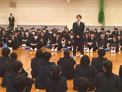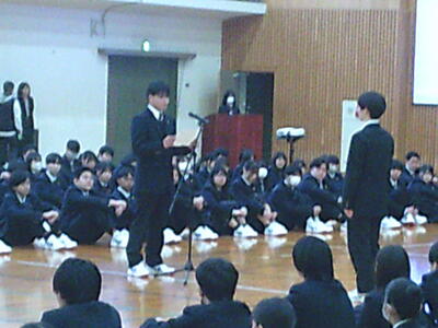その後、対面式を行いました。生徒会長の藤田さんのことばに対して、1年生の桑原田さんもしっかりとことばを返していました。