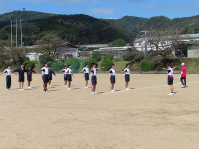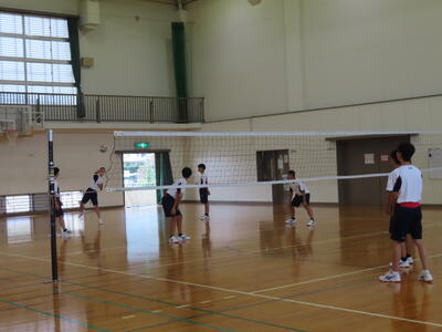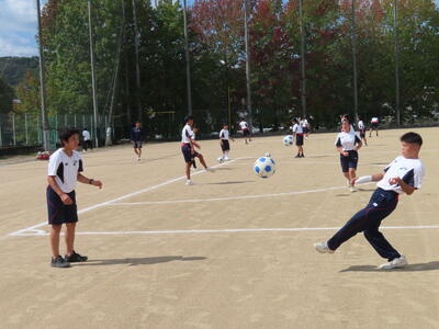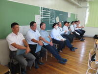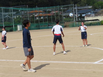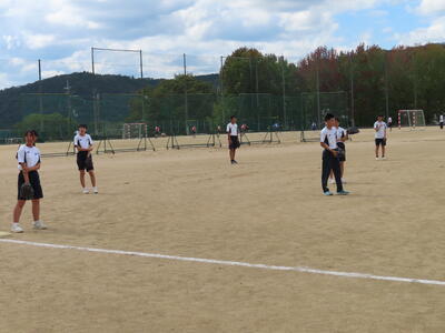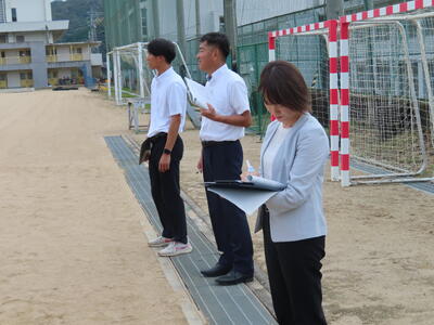 校長室で本校の取組を説明した後、3時間目に1年生1,2組の体育のサッカー、ソフトボール、バレーボールの授業を見学されました。生徒たちは、これまでの成果としてそれぞれ熱心に取り組み、大久保主任指導主事からは、担当の浦崎先生、肥塚先生、牧先生が生徒の反応を丁寧に受け止めて指導していると言って頂きました。