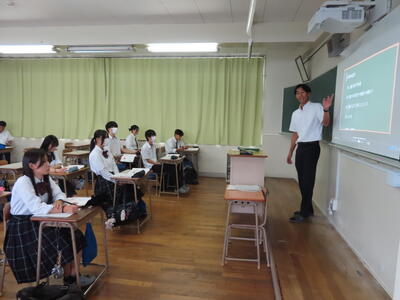 4時間目は、2年5組の保健の授業で、鍬田先生が担当し、「働くことと健康」の単元を、ICTを工夫して生徒に考えさせる授業を展開していました。「宝くじが10億円当たったら仕事をやめるか?」を考えさせたり、「給料は高いが働きがいのなし仕事」と、「給料は安いが働きがいがある仕事」のどちらを選ぶかも意見が分かれて面白かったです。大久保主任指導主事からは、生徒を学習に向かわせようとする先生の働きかけが印象であったと言って頂きました。