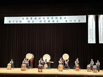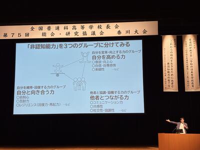 初日は、開会式の後、文部科学省の橋田裕参事官から、「高等学校をめぐる現状と今後の方向性」について講話があり、香川県立農業経営高等学校拓心太鼓部のアトラクションがあり、「これからの時代を生きるために必要な非認知能力の育て方」について中山芳一氏から記念講演があり、本校でも非認知能力を育てる工夫が必要であると感じました。