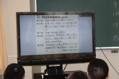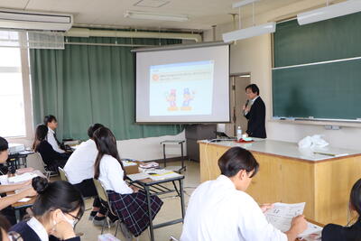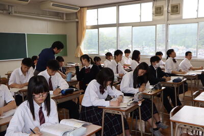 5限の公開授業では、1年3組普通科での古語文化(古典分野)の萩原先生の授業は、故事成語の由来と意味を調べる内容で、タブレットを使ってPowerPointを作成して発表原稿をまとめていました。2年3組の普通科での古典探究の岡本先生の授業では、「頭髪上指す」を学習し自分の考えをワークシートに記入してグループで議論する内容でした。