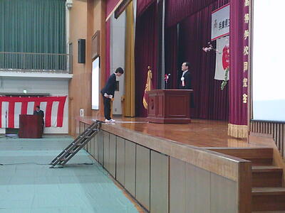 着任式・始業式が行われました。着任式では、本校主幹教諭から教頭になった前野教頭先生、本校事務室主査の山田さんが事務長に昇任して、着任されました。