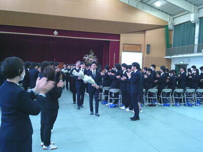 生徒を代表して、生徒会長の藤田耀太さんが離任される先生方、1人1人にメッセージを伝え、お別れの挨拶としました。