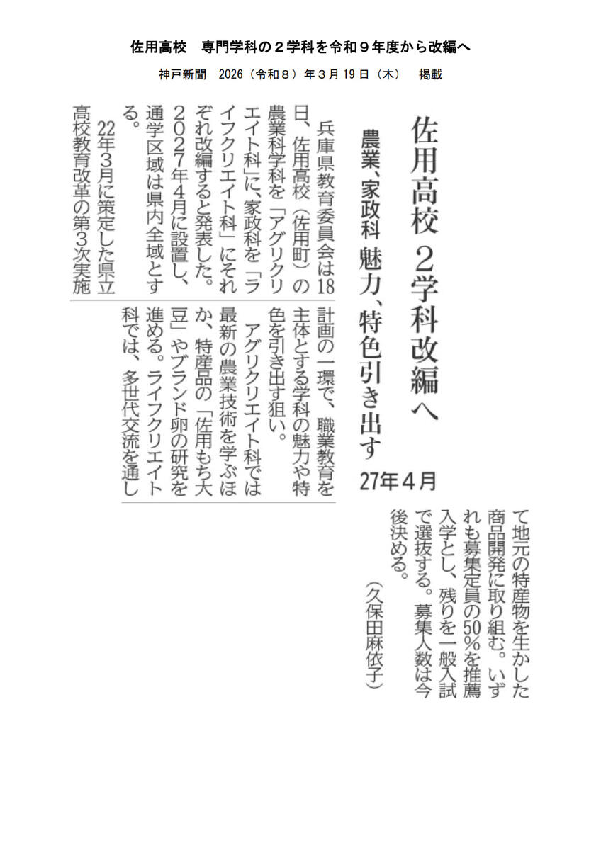 令和9年度に専門学科2学科(アグリクリエイト科・ライフクリエイト科)改編について神戸新聞に掲載【3月19日】