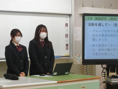 上津中学校2年生20名と、家政科2年生・課題研究食物班7名が一緒に学び、