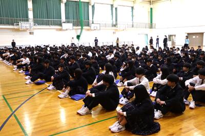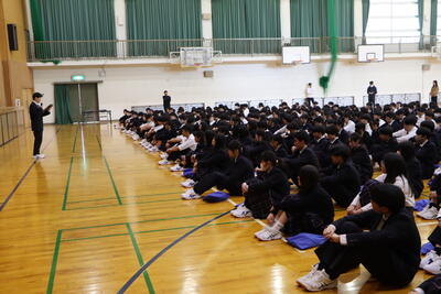 続いて、西はりま天文台まで移動し、クラス写真を撮ってから弁当を食べて、その後レクレーションを行いました。クラス対抗の大縄跳びは、3組が大変上手でした。2人1組で鉛筆を指に載せてのリレーは、何度も落としながらも息を合わせて走り最後まで他クラスも応援していました。最後は、話をせずに誕生日順に1列に並んで誕生日を順番に言っていきました。1組だけ順番が違いましたが「おめでとう」の声を掛けて盛り上がりました。校長の私と同じ誕生日の生徒もあり握手しました。