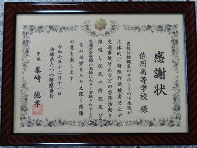 12月11日(木)、本校の生徒会やこっこくらぶの行った特殊詐欺防止や交通事故防止の啓発活動が評価され、たつの警察署長から表彰を受けました。本校の生徒みんなで取り組んだ成果だと思います。終了後に、新聞社から取材も受けました。特殊詐欺や交通事故が減れば嬉しく思います。