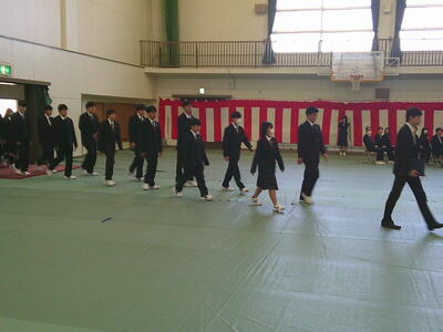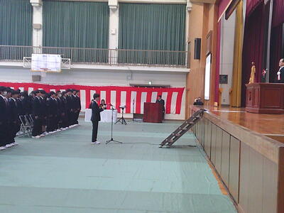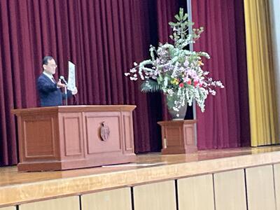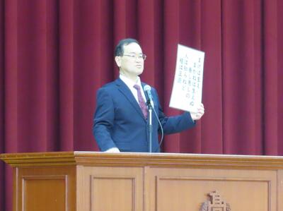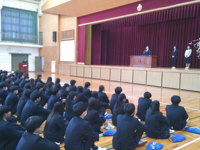 その後、始業式を行い、校長式辞では「クリエイトハイスクール~新たな学びで新たな価値を創造する高校~」とスローガンを掲げ、本校は大きく変わろうとしていることや、教員の校務分掌が、総務部から総務・広報部として広報活動にも力を入れ、生徒指導部と保健部を指導と支援の両面からサポートする生徒支援部、進路指導部に図書を含めて進路指導・図書部と変更して新たな体制で生徒を支援することを伝えました。さらに、「まけば生え まかねば生えぬ 善し悪しの 人は知らねど 種は正直」の歌から、悪い行為をすれば悪い結果が返ってくるし、良い行為をすれば良い結果が返ってくるので、貯金しているつもりで一緒に頑張ろうと伝えました。(校長式辞の詳細は後に掲載)