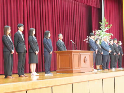 4月8日(水)、まずはじめに令和8年度着任式を行いました。前野教頭先生と山田事務長は、昨年度まで本校におられましたが昇任して着任され、前野教頭先生が2人を代表してあいさつされました。その後、新たに着任された11人の先生方を、校長の私から紹介し、代表で垣内先生(農業)があいさつをされました。