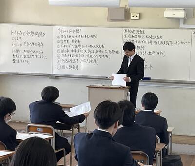 専門部の各部長、副部長、委員長、科長、学年主任の先生方を紹介して、学年団の先生方も発表しました。ホームルーム担任が今年度から変わって、ショックを受けた生徒もあるかもしれませんが、新たなクラスで今年度を頑張って欲しいと願っています。