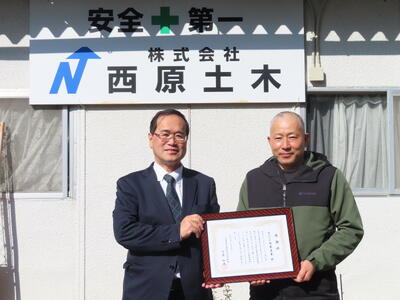 2月4日(水)13時に西原土木を訪れて、代表取締役の西原弘達さんに対して、校長から感謝状を贈呈しました。