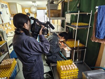 朝に放送されている「THE TIME,」の「全国!中高生ニュース」の企画で、「卵フェス」で全国3位となった、本校の鶏卵「さよたま」とそれに取り組んでいる生徒を、本校の生徒が紹介するといった内容です。全国ネットでテレビ放送されます。