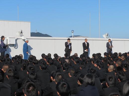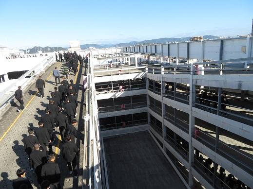 1校時に地震津波一斉避難訓練が行われ、二次避難場所である姫路リバーシティーの屋上駐車場に避難しました。避難完了後、姫路リバーシティーの担当者、校長、副校長より防災講話をいただきました。