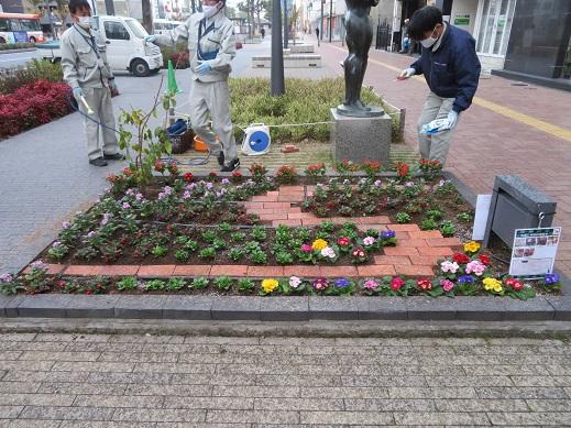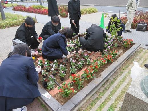 一般財団法人姫路市まちづくり振興機構 緑化推進部の方々にご指導いただき、生徒たちがデザインした花壇や緑化推進部の方がデザインされた花壇の植え替えを行いました。