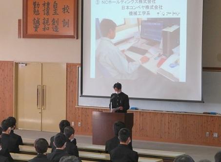 11月9日(月)~11月13日(金)の5日間に実施されたインターンシップで体験したことを、2年次の代表生徒5名が報告しました。5日間を通して各企業にて社員の方々が真剣に働く姿を見たり、丁寧に仕事を教えていただく中で、働くことの大変さを知り、忍耐力が必要だということを学ぶことができたようです。お世話になった各企業の皆様、本当にありがとうございました。