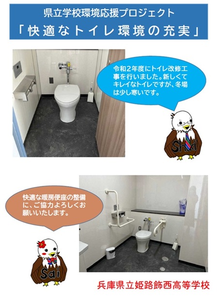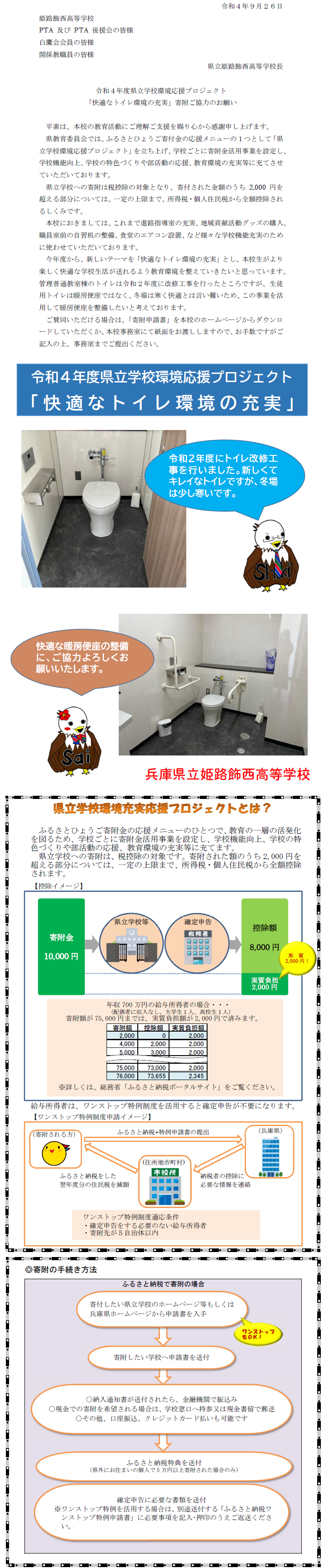 本校では、令和4年度から新しいテーマを「快適なトイレ環境の充実」とし、本校生がより楽しく快適な学校生活が送れるよう教育環境を整えていきたいと思っています。管理普通教室棟のトイレは令和2年度に改修工事を行ったところですが、生徒用トイレは暖房便座ではなく、冬場は寒く快適とは言い難いため、この事業を活用して暖房便座を整備したいと考えております。ご賛同いただける場合は、「寄附申出書(pdf様式)」を本校のホームページからダウンロードしていただくか、本校事務室にて紙面をお渡ししますので、お手数ですがご記入の上、事務室までご提出ください。