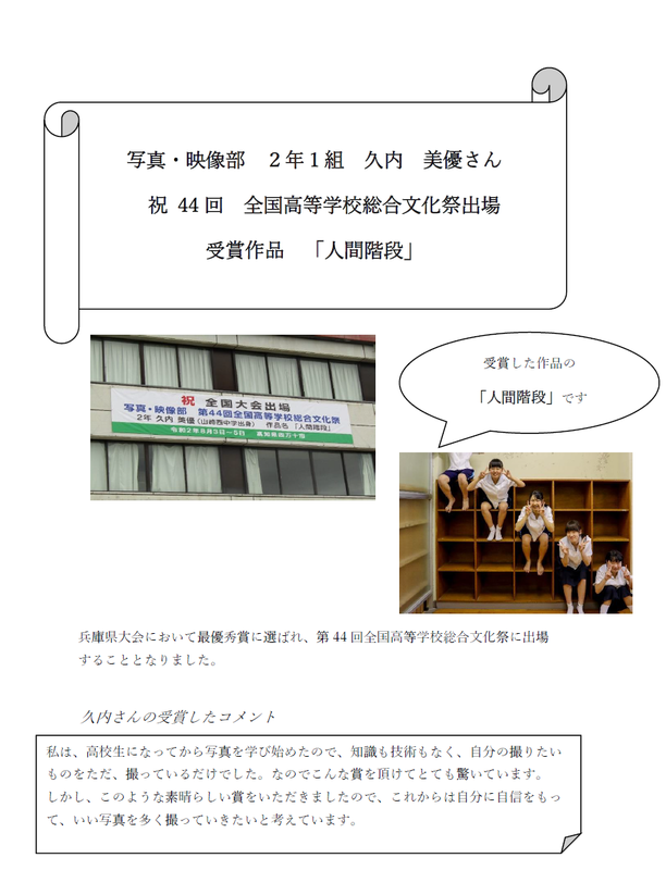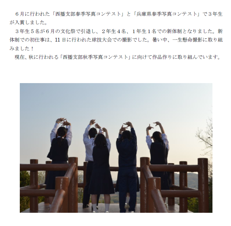 現在、部員は3年生2名、2年生5名、1年生9人です。毎週金曜日に活動しています。適宜、自分の好きな風景や人物等を撮ると共に、学校行事や部活動の様子を撮影して、文化祭で発表したりしています。また、春と秋に行われるコンテストに応募したりもしています。