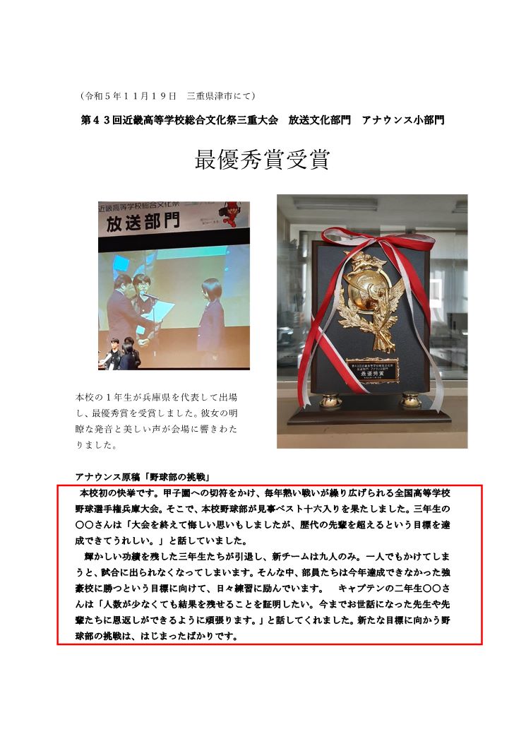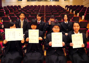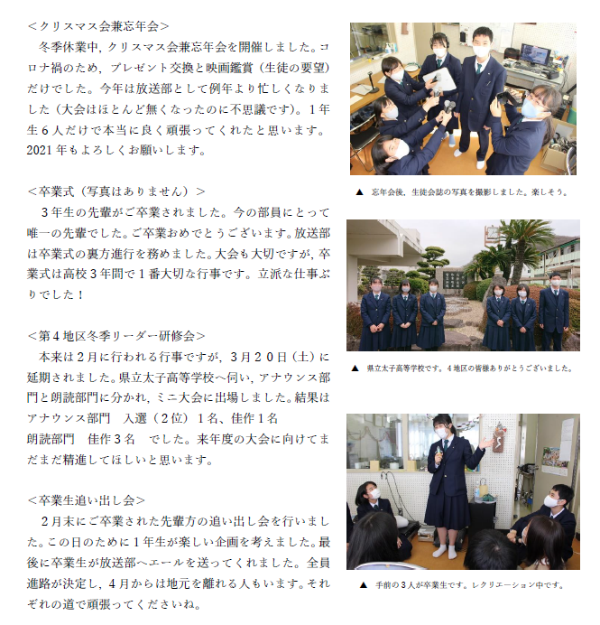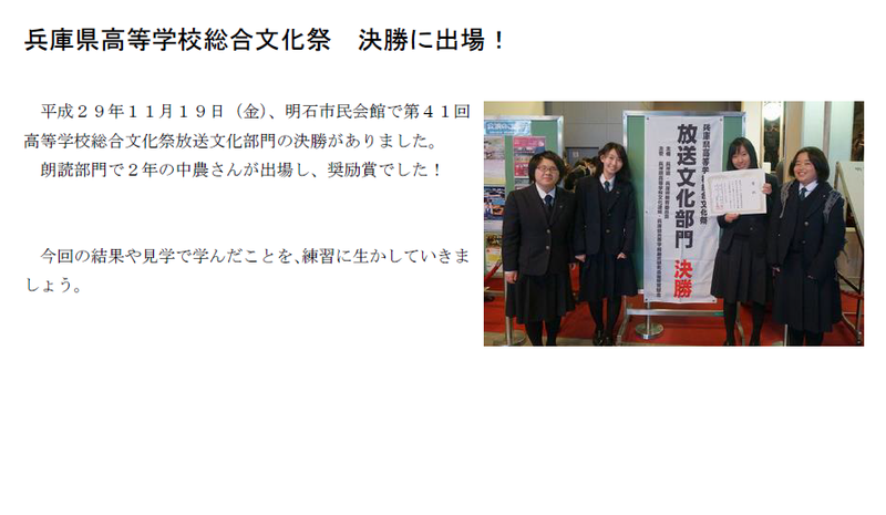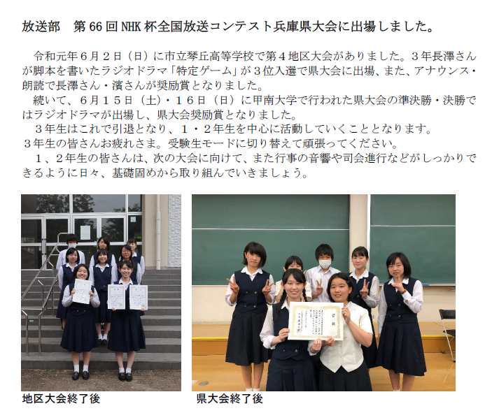 アナウンス部門と朗読部門において、上級・中級・初級の班に分かれ、発声方法やアナウンス・朗読技術習得のための研修を受けました。 中級と初級ではコンテストも催され、アナウンス部門では大江優花さん(2年)が見事に第3位に輝き、日髙友絵さん(1年)が奨励賞を受賞しました。朗読部門でも、中農地さん(1年)が奨励賞を受賞し、学校対抗において優秀学校賞(2位)を手にすることができました。 コンテストは催されませんでしたが、朗読部門において小西真悠子さん(2年)が上級に参加しました。FM-GENKIのプロのアナウンサーから研修を受ける一日となり、来年度のNHK杯全国高校放送コンテストに向けて朗読の技術を磨くことができました。 応援ありがとうございました。 ◎アナウンス部門(中級・初級) 大江 優花(2年) 3位 日髙 友絵(1年) 奨励賞 ◎朗読部門(中級・初級) 中農 地 (1年) 奨励賞 ◎学校賞 優秀学校賞(2位) |