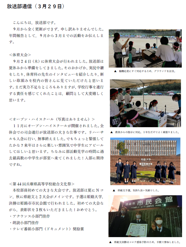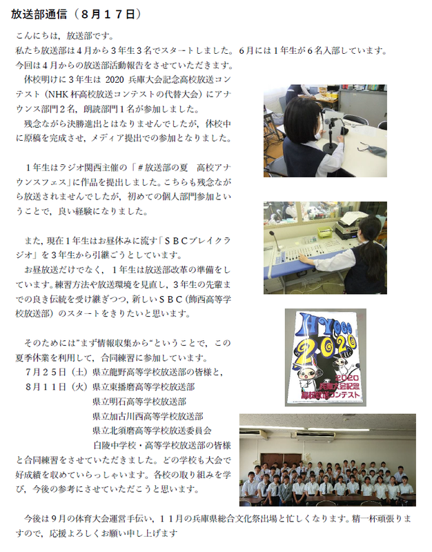 (令和6年6月)6月2日、NHK杯全国高校放送コンテストの地区予選では、アナウンス部門で2年生の部員が優勝し、朗読部門で3年生の3名が上位に入り、アナウンス部門と朗読部門で合計4名が県大会に進むことになりました。昨年度は、近畿総合文化祭放送文化部門アナウンス小部門で最優秀賞を受賞しております。在校生の皆さんには、お昼のDJ(12:45~ 「SBCブレイクタイム」)でお馴染みの放送部ですが、音楽はもちろんのこと、私たちの声にも耳を傾けてください。