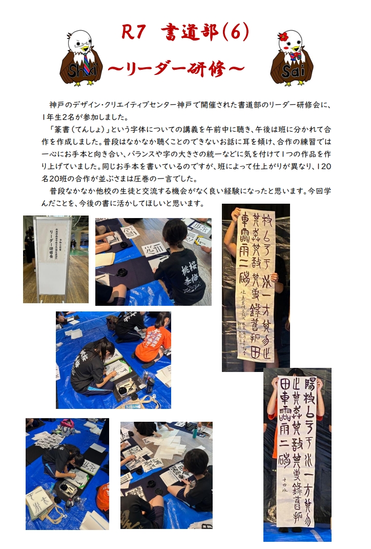 部長からのメッセージ:先輩、後輩関係なく和気あいあいとした雰囲気があります。また互いにアドバイスし合うことできれいな字を追求できるのは書道部だからこそです。書道を習ったことのない人も経験者も大歓迎です。