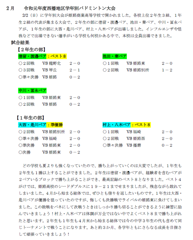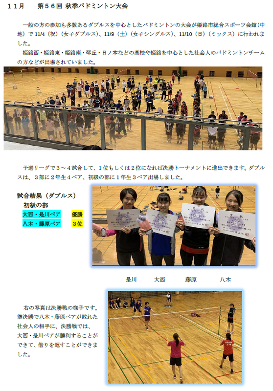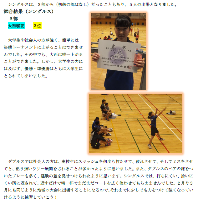 | 活動の様子・戦績など | バドミントン女子 2月姫路オープン大会に参加しました。 |