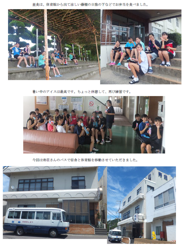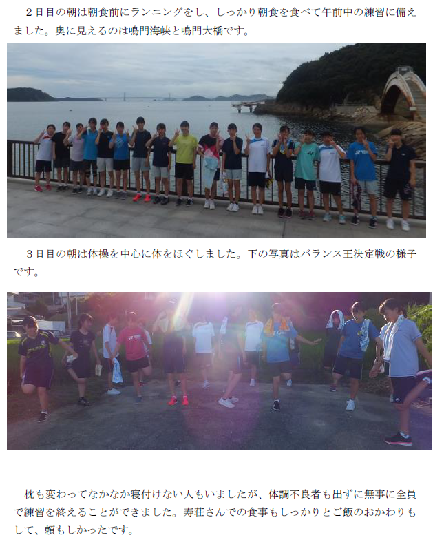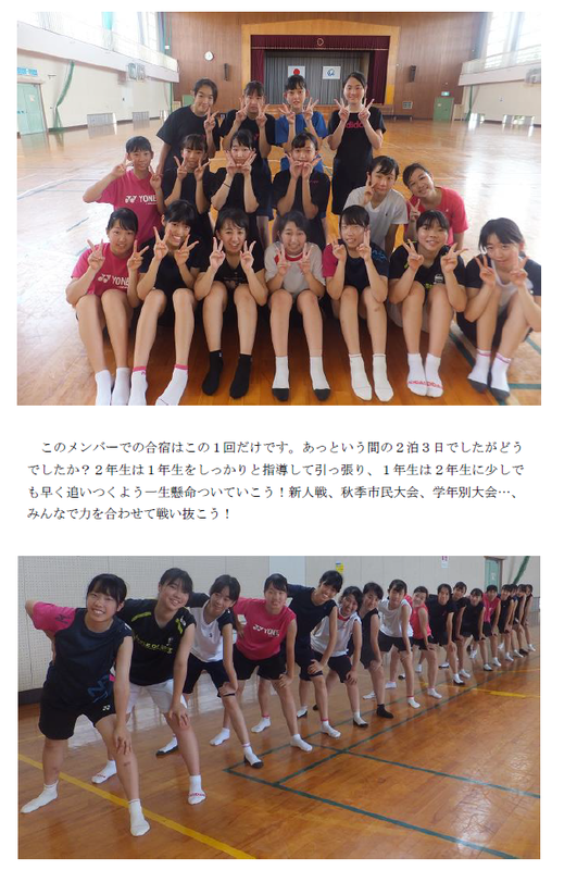 【団体】3位 【個人】ダブルス 9位 井上・山戸組(県大会出場) ベスト16 有居・松上組 5日間と長い日程の大会が終了した。団体3位となることができた。新入部員が入部したことによって戦力アップしたことは確かだが、3年生もよく頑張った。今回の団体であらためて感じたことは応援の素晴らしさである。ベンチに入っているが、試合に出ない選手もいる。必死に仲間を応援する槇に感動した。また、観客席からの応援も素晴らしかった。仲間なんだなあとしみじみ思った。ダブルスはベスト16に2組残り、順位決定戦で県大会出場2枠をかけてのトーナメント戦に挑んだ。有居・松上組は初戦で敗退したが、ここまでよく頑張ったと思う。力はあるが、勝てないペアであった。競り合いになると、焦りからか連続ミスをしてしまうことが多くあきらめてしまうことがあったが、16掛けの試合では、焦ることなく丁寧な試合運びをすることができ本人たちも満足したことであろう。井上・山戸組は、トーナメントで1回も負けることなく9位という結果で県大会出場を果たした。トーネメント2回戦、ここで勝ったら県大会に出場できるという試合では、リードしていたのに、20-20と追いつかれどうなることかと思ったが、粘り強くシャトルを追いかけている姿が印象的であった。キャプテンの井上はシングルスでも県大会出場を目指していたが、16掛けで第2ゲーム20-17とリードしていながら、追いつかれ落としてしまった。ファイナルゲームは焦りからか納得いかなかったかもしれない。しかし、本当にここまで大人数のチームを引っ張ってくれた。ご苦労様でした。新キャプテン、濱田頑張ろう!!! |