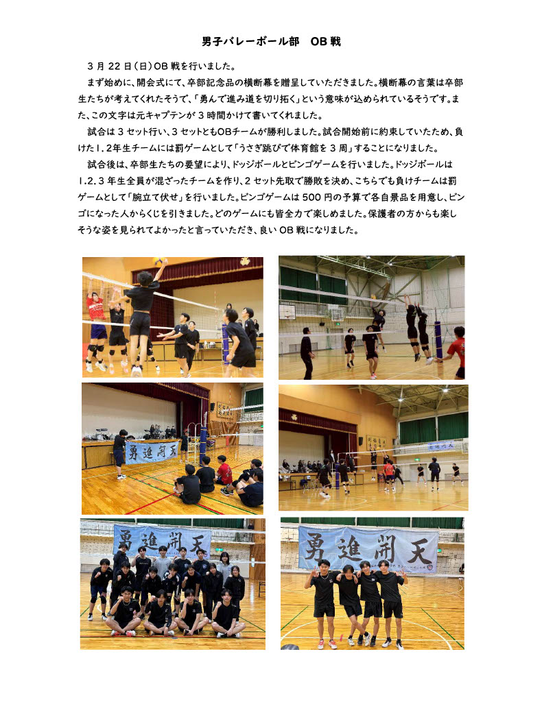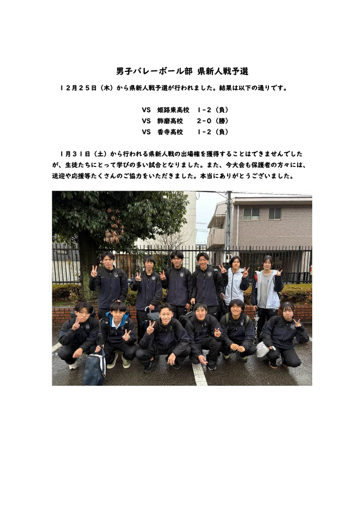 バレーボール部 全ての記事 全ての記事 カテゴリ 今日の出来事 連絡事項 報告事項 ミーティング 本・雑誌 ニュース 映画・テレビ 音楽 スポーツ パソコン・インターネット ペット 総合学習 アニメ・コミック アーカイブ 2026年4月 (0) 2026年3月 (3) 2026年2月 (1) 2026年1月 (2) 2025年12月 (1) 2025年11月 (0) 2025年10月 (1) 2025年9月 (2) 2025年8月 (5) 2025年7月 (1) 2025年6月 (4) 2025年5月 (4) 2025年4月 (0) 2025年3月 (2) 2025年2月 (1) 2025年1月 (1) 2024年12月 (0) 2024年11月 (1) 2024年10月 (0) 2024年9月 (1) 2024年8月 (1) 2024年7月 (1) 10件 1件 5件 10件 20件 50件 100件 男子バレーボール部 OB戦 投稿日時 : 03/31 volleyball 女子バレーボール部 3年生を送る会 投稿日時 : 03/05 volleyball 男子バレーボール部 卒部式 投稿日時 : 03/05 volleyball 男子バレーボール部 ボディーケア講習会・審判講習会 投稿日時 : 02/12 volleyball 女子バレーボール部 後期西播大会 投稿日時 : 01/08 volleyball 男子バレーボール部 県新人戦予選 投稿日時 : 01/08 volleyball 男子バレーボール部 秋季西播大会 投稿日時 : 2025/12/01 volleyball 男子バレーボール部 選手権大会西播予選 投稿日時 : 2025/10/01 volleyball 女子バレーボール部 選手権大会西播予選 投稿日時 : 2025/09/30 volleyball 姫路市民大会・夏休み 投稿日時 : 2025/09/02 volleyball 1234 »