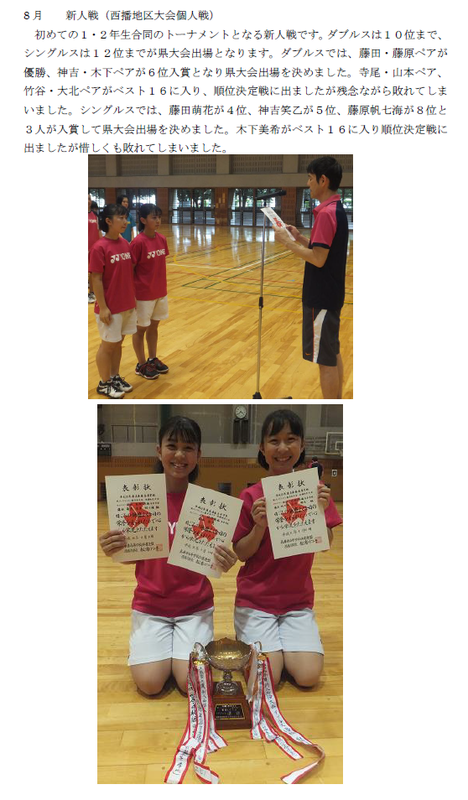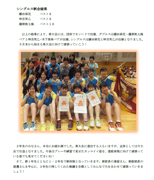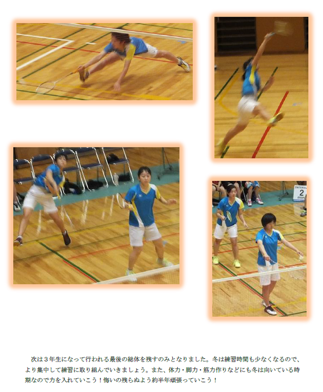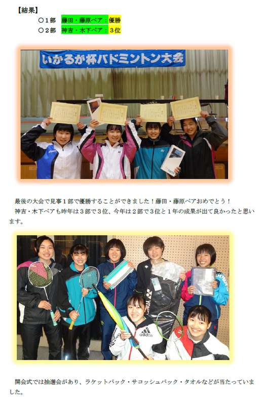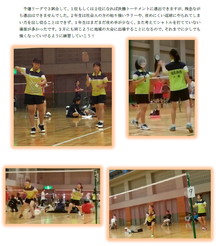 リーグ戦2試合を行い2勝し、トーナメント戦に進出した。トーナメント戦では、すべてファイナルゲームまでいく接戦であった。2人が必死にシャトルを追いかけ、ラリーを続けることを意識した試合展開で、見事優勝を果たした。特に、藤田の粘り強いレシーブに、感心した。