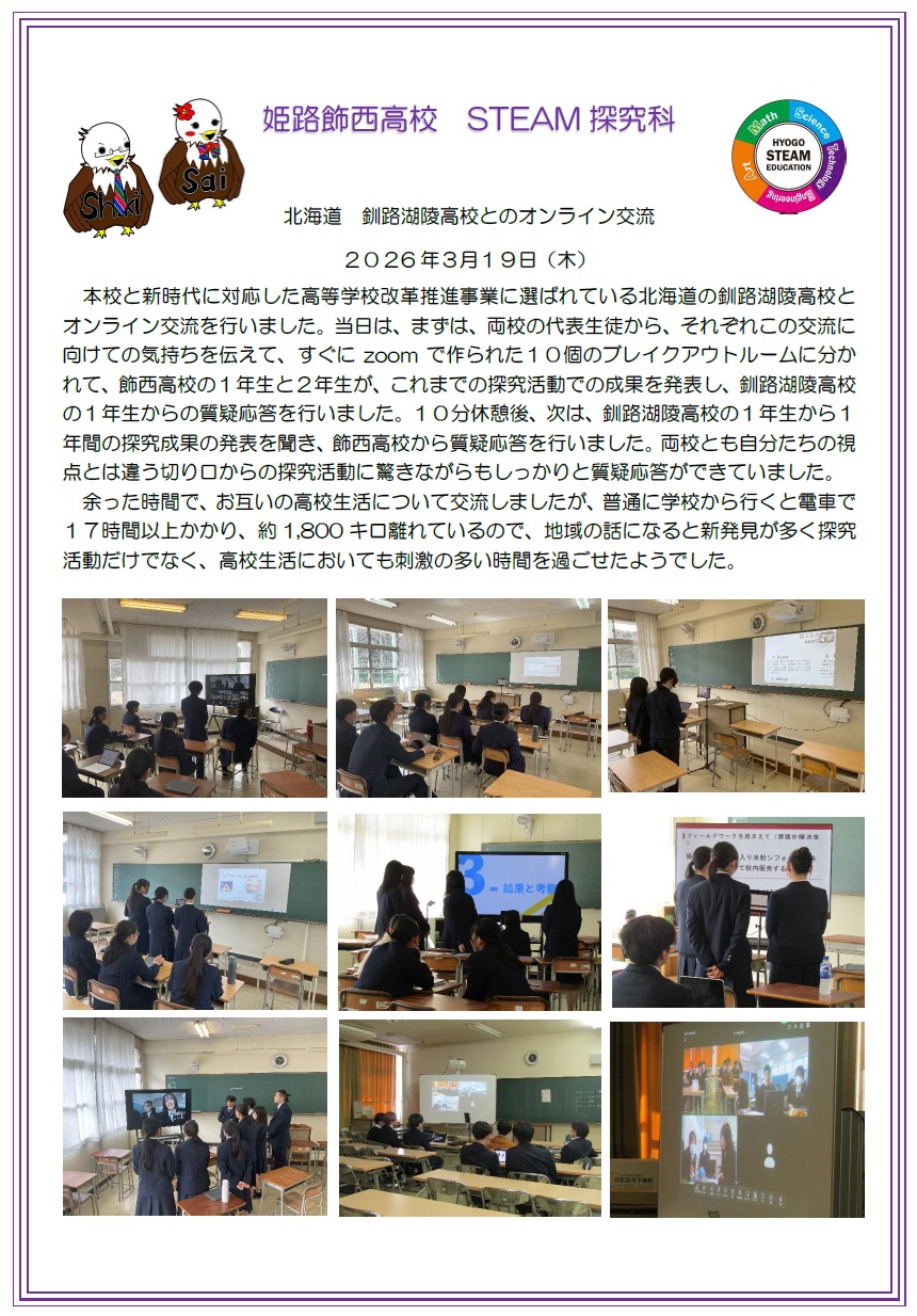 STEAM探究科 全ての記事 全ての記事 アーカイブ 2026年4月 (2) 2026年3月 (5) 2026年2月 (6) 2026年1月 (9) 2025年12月 (10) 2025年11月 (8) 2025年10月 (11) 2025年9月 (7) 2025年8月 (5) 2025年7月 (10) 2025年6月 (6) 2025年5月 (8) 2025年4月 (4) 2025年3月 (0) 2025年2月 (4) 2025年1月 (5) 2024年12月 (2) 2024年11月 (6) 2024年10月 (5) 2024年9月 (1) 2024年8月 (3) 2024年7月 (3) 2024年6月 (5) 2024年5月 (2) 2024年4月 (1) 2024年3月 (0) 2024年2月 (0) 2024年1月 (0) 2023年12月 (0) 2023年11月 (0) 2023年10月 (0) 2023年9月 (0) 2023年8月 (0) 2023年7月 (0) 2023年6月 (0) 2023年5月 (1) 2023年4月 (4) 10件 1件 5件 10件 20件 50件 100件 STEAM探究科 北海道の高校とのオンライン交流 投稿日時 : 18:11 STEAM探究科 年次縦断型報告会 投稿日時 : 04/01 STEAM探究科 STEAM探究Ⅰ SDGs探究×研究 サイエンスフォーラム 投稿日時 : 03/27 STEAM探究科 STEAM探究Ⅰ 探究は進路につながるのか 投稿日時 : 03/27 STEAM探究科 STEAM探究Ⅰ アントレプレナーシップ講演会 投稿日時 : 03/27 STEAM探究科 探究成果発表会講評 投稿日時 : 03/23 STEAM探究科 イベントにまちおこしの可能性 投稿日時 : 03/23 STEAM探究科 STEAM探究Ⅰ はばタンのデザイナー 来校 来年度に向けて 投稿日時 : 02/25 STEAM探究科 STEAM探究基礎 探究成果発表会 投稿日時 : 02/17 STEAM探究科 English with STEAM Ⅰ One word graphics冊子完成! 投稿日時 : 02/17 STEAM探究科 123456789 »