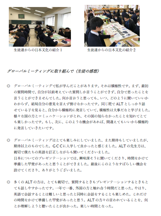 GCC 全ての記事 全ての記事 アーカイブ 2025年12月 (0) 2025年11月 (0) 2025年10月 (0) 2025年9月 (0) 2025年8月 (0) 2025年7月 (0) 2025年6月 (0) 2025年5月 (0) 2025年4月 (0) 2025年3月 (0) 2025年2月 (0) 2025年1月 (0) 2024年12月 (0) 2024年11月 (0) 2024年10月 (0) 2024年9月 (0) 2024年8月 (0) 2024年7月 (0) 2024年6月 (0) 2024年5月 (0) 2024年4月 (0) 2024年3月 (0) 2024年2月 (0) 2024年1月 (0) 2023年12月 (0) 2023年11月 (0) 2023年10月 (1) 2023年9月 (1) 2023年8月 (0) 2023年7月 (1) 2023年6月 (0) 2023年5月 (0) 2023年4月 (0) 2023年3月 (2) 2023年2月 (4) 2023年1月 (2) 2022年12月 (1) 2022年11月 (1) 2022年10月 (1) 2022年9月 (1) 2022年8月 (1) 2022年7月 (1) 2022年6月 (0) 2022年5月 (0) 2022年4月 (0) 2022年3月 (0) 2022年2月 (3) 2022年1月 (5) 2021年12月 (0) 2021年11月 (1) 2021年10月 (1) 2021年9月 (2) 2021年8月 (0) 2021年7月 (0) 2021年6月 (0) 2021年5月 (0) 2021年4月 (0) 2021年3月 (1) 2021年2月 (3) 2021年1月 (0) 2020年12月 (1) 2020年11月 (0) 2020年10月 (0) 2020年9月 (2) 2020年8月 (0) 2020年7月 (0) 2020年6月 (4) 2020年5月 (0) 2020年4月 (0) 2020年3月 (0) 2020年2月 (0) 2020年1月 (0) 2019年12月 (0) 2019年11月 (0) 2019年10月 (0) 2019年9月 (0) 2019年8月 (0) 2019年7月 (0) 2019年6月 (0) 2019年5月 (0) 2019年4月 (0) 2019年3月 (0) 2019年2月 (1) 2019年1月 (0) 2018年12月 (0) 2018年11月 (0) 2018年10月 (0) 2018年9月 (0) 2018年8月 (0) 2018年7月 (0) 2018年6月 (0) 2018年5月 (0) 2018年4月 (0) 2018年3月 (1) 2018年2月 (2) 2018年1月 (0) 2017年12月 (0) 2017年11月 (0) 2017年10月 (0) 2017年9月 (1) 2017年8月 (0) 2017年7月 (1) 2017年6月 (0) 2017年5月 (0) 2017年4月 (0) 2017年3月 (1) 2017年2月 (2) 2017年1月 (0) 2016年12月 (0) 2016年11月 (0) 2016年10月 (0) 2016年9月 (0) 2016年8月 (1) 2016年7月 (1) 2016年6月 (0) 2016年5月 (0) 2016年4月 (0) 2016年3月 (1) 2016年2月 (2) 2016年1月 (0) 2015年12月 (0) 2015年11月 (2) 2015年10月 (0) 2015年9月 (0) 2015年8月 (0) 2015年7月 (0) 2015年6月 (0) 2015年5月 (0) 2015年4月 (0) 2015年3月 (1) 2015年2月 (1) 2015年1月 (0) 2014年12月 (0) 2014年11月 (0) 2014年10月 (0) 2014年9月 (0) 2014年8月 (0) 2014年7月 (0) 2014年6月 (0) 2014年5月 (0) 2014年4月 (0) 2014年3月 (1) 2014年2月 (1) 2014年1月 (2) 2013年12月 (1) 2013年11月 (1) 20件 1件 5件 10件 20件 50件 100件 1年GCC 〈香港〉オンライン交流を実施 投稿日時 : 2022/01/28 システム管理者 1年GCC Matthew John Rooks 先生(神戸大学) 投稿日時 : 2022/01/28 システム管理者 2年GCC 特別講義(宇佐美 慎吾さん) 投稿日時 : 2022/01/28 システム管理者 2年GCC ディベート講義 投稿日時 : 2022/01/28 システム管理者 高校生 模擬国連大会参加 投稿日時 : 2022/01/13 システム管理者 【GCC】インドの学校との共同学習 投稿日時 : 2021/11/10 システム管理者 GCC特別講義(1年生) 投稿日時 : 2021/10/07 システム管理者 安河内哲也先生 GCC特別講義(1年生) 投稿日時 : 2021/09/30 システム管理者 安河内哲也先生 GCC特別講義.pdf イングリッシュセミナー(2年1組) 投稿日時 : 2021/09/02 システム管理者 1年生GCC 特別講演 投稿日時 : 2021/03/16 システム管理者 2年生GCC スカイリッジ高校とのオンライン交流 投稿日時 : 2021/02/18 システム管理者 GCC2021 35回生オンライン交流.pdf 2年生GCC 3校対抗ディベート大会 投稿日時 : 2021/02/10 システム管理者 GCC 3校ディベート大会.pdf 1年生GCC グローバル・ミーティング 投稿日時 : 2021/02/05 システム管理者 GCC 1年1組 特別講義 投稿日時 : 2020/12/16 飾西高校管理者 GCC 1年1組 特別講義.pdf GCC 2年1組 ディベート特別講義 投稿日時 : 2020/09/23 飾西高校管理者 ディベート講演会.pdf 2年GCC Global Classmate(グローバル・クラスメート)開始 投稿日時 : 2020/09/07 飾西高校管理者 GCC Global Classmate.pdf 2年生 ディベート大会 投稿日時 : 2020/06/19 飾西高校管理者 2年生 ディベート大会.pdf 1年生 グローバルミーティング 投稿日時 : 2020/06/19 飾西高校管理者 1先生 グローバルミーティング.pdf 2年生 (ディベート特別講義) 投稿日時 : 2020/06/19 飾西高校管理者 2年生 (ディベート特別講義).pdf 1年生 特別講演 (ガーナが教えてくれたこと) 投稿日時 : 2020/06/19 飾西高校管理者 ガーナが教えてくれたこと.pdf « 1234 »