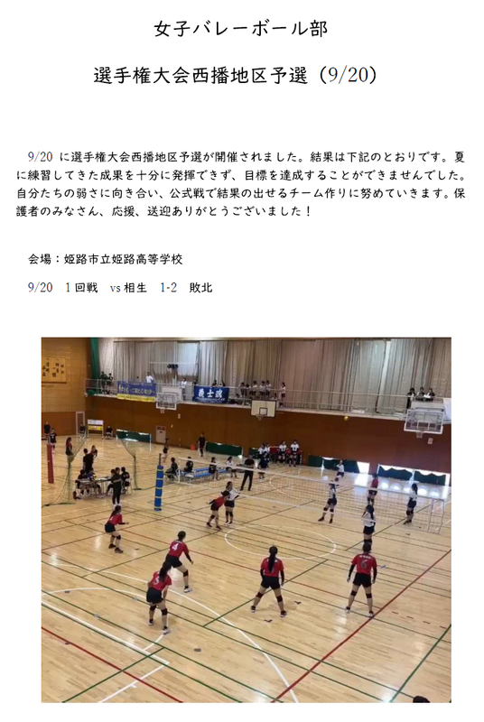バレーボール部 全ての記事 全ての記事 カテゴリ 今日の出来事 連絡事項 報告事項 ミーティング 本・雑誌 ニュース 映画・テレビ 音楽 スポーツ パソコン・インターネット ペット 総合学習 アニメ・コミック アーカイブ 2025年10月 (1) 2025年9月 (2) 2025年8月 (5) 2025年7月 (1) 2025年6月 (4) 2025年5月 (4) 2025年4月 (0) 2025年3月 (2) 2025年2月 (1) 2025年1月 (1) 2024年12月 (0) 2024年11月 (1) 2024年10月 (0) 2024年9月 (1) 2024年8月 (1) 2024年7月 (1) 20件 1件 5件 10件 20件 50件 100件 男子バレーボール部 選手権大会西播予選 投稿日時 : 10/01 volleyball 女子バレーボール部 選手権大会西播予選 投稿日時 : 09/30 volleyball 姫路市民大会・夏休み 投稿日時 : 09/02 volleyball 女子バレーボール部 姫路市民大会 投稿日時 : 08/28 volleyball 女子バレーボール部 夏合宿の様子 投稿日時 : 08/25 volleyball 男子バレーボール部 海トレーニング 投稿日時 : 08/20 volleyball 女子バレーボール部 西播地区リーグ戦 投稿日時 : 08/18 volleyball 男子バレーボール部 リーグ戦 投稿日時 : 08/07 volleyball 男子バレーボール部 HADO体験 投稿日時 : 07/28 volleyball 男子バレーボール部 鷹山祭の様子 投稿日時 : 06/27 volleyball 男子バレーボール部 卒業アルバム写真撮影 投稿日時 : 06/06 volleyball 女子バレーボール部 兵庫県総合体育大会 投稿日時 : 06/05 volleyball 男子バレーボール部 兵庫県総合体育大会 投稿日時 : 06/03 volleyball 女子バレーボール部 関西福祉大学にて 投稿日時 : 05/28 volleyball 女子バレーボール部 GW 練習試合 投稿日時 : 05/08 volleyball 女子バレーボール部 前期西播大会 投稿日時 : 05/01 volleyball 男子バレーボール部 前期西播大会 投稿日時 : 05/01 volleyball 男子バレーボール部 OB戦 投稿日時 : 03/18 volleyball 男子バレーボール部 卒部式 投稿日時 : 03/03 volleyball 男子バレーボール部 兵庫県新人戦 投稿日時 : 02/18 volleyball 12 »
