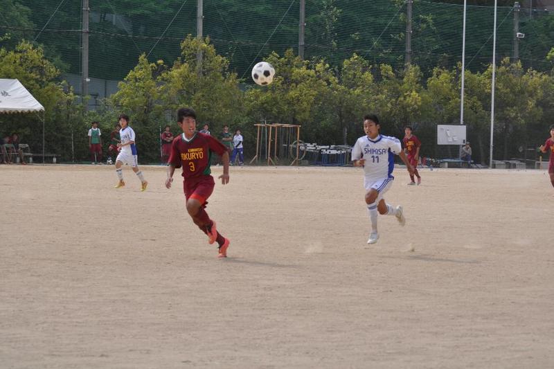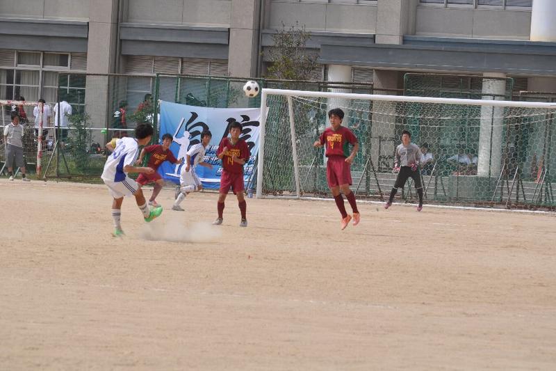 11月14日(土)予選リーグ2日目は、まず姫路商と対戦。プレーの精度を欠き、なかなかチャンスを作れない。後半12分、4人が交替したが流れを変えられず、ゴール前までボールを運んでも決定機までは至らない。そのまま試合終了かと思われたが、終了1分前にゴール前に流れてきたボールをFWがすべり込みながらシュートし、ようやく得点。そのまま1-0で勝利した。続いて市川と対戦。前半は得点を積み重ねて4-0で折り返したが、後半は攻めあぐねて得点を奪えず、逆に失点をして4-1で試合終了。この時点では2位以内は決まらず、直後の姫路東対香寺の試合結果に命運をゆだねることとなった。その結果、香寺が1-0で勝利し、3チームが3勝1敗で並んだが、本校は得失点差で3位となり、予選リーグ敗退が決まった。非常に悔しい結果となったが、これを糧に練習に励み、1ヶ月後の新人大会では雪辱を果たしたい。