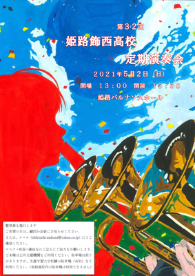 2021年5月2日(日)姫路パルナソスホールで予定しておりました定期演奏会は、緊急事態宣言に伴う施設の休館に伴い延期させていただきます。延期の日程等につきましては、現在調整中のため改めてご案内いたします。          ご理解よろしくお願いします。