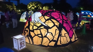 「姫路夏あかり」には今年初めての参加でした。 部員4名でドームを作成しました。最初はうまくできるか不安でいっぱいでしたが、いろいろな方々にアドバイスをいただいたり、支えていただいて何とか完成させることができました。点灯したときには予想以上にきれいに見えて、とても感動しました。お手伝いくださった方々、どうもありがとうございました。 |