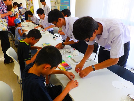 | 活動の様子・戦績など | 兵庫県立大学工学キャンパスで開催された「青少年のための科学の祭典2016」に自然科学部が「コンクリート水路の絶滅危惧種」・「身のまわりの色を分けてみよう!」で出展しました。身近にいる珍しい昆虫「トゲナベブタムシ」の生態を説明したり、いろいろな色を分離させて色のつくりについての科学的な現象を、子どもたちにわかりやすく説明しました。 |