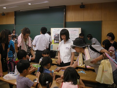 | 活動の様子・戦績など | 兵庫県立大学姫路工学キャンパスで開催された「青少年のための科学の祭典2017」に自然科学部は2つのブースを出展しました。姫路飾西高等学校周辺にいる絶滅危惧種のトゲナベブタムシの研究と工作実験「輪ゴムの力でロケットを飛ばそう!」。子どもたちは見たり作ったりすることを楽しみ、部員はトゲナベブタムシについての説明や、ロケット工作の手順や方法を説明で、説明する力をつけることができました。充実した2日間でした。 |